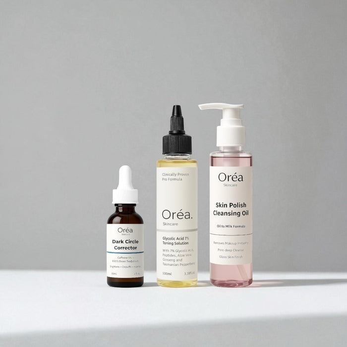 Transform your skincare game with The ORÉA Ritual Set — a powerhouse trio designed to cleanse, renew, and revive your skin from every angle. Featuring our Skin Polish Cleansing Oil, Glycolic Acid 7% Toning Solution, and Caffeine 5% Dark Circle Corrector, this bundle is your all-in-one solution for glowing skin and brighter eyes.